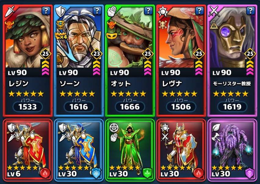 ここが抜かれると一気に厳しくなるため、守備HP特化のやられにくい英雄を配置する。